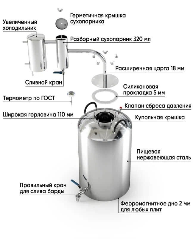 Благодаря тому, что холодильник улучшен, а царга расширена до 18 мм, получайте ещё более крепкий дистиллят.